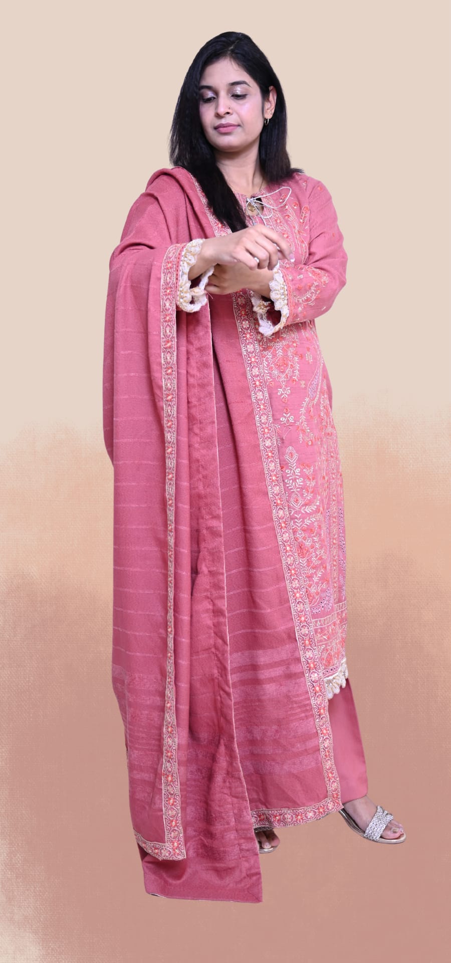Featuring a shirt, lower, and shawl made from premium Peach Leather fabric, beautifully enhanced with delicate embroidery and lace detailing for an elegant and sophisticated look.